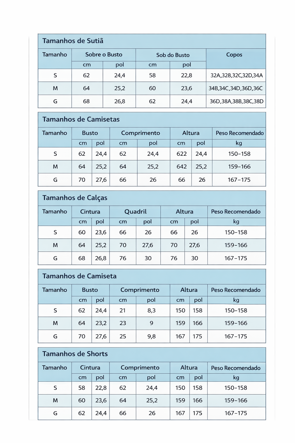 Se estiver em dúvida entre dois tamanhos, recomendamos escolher o maior.